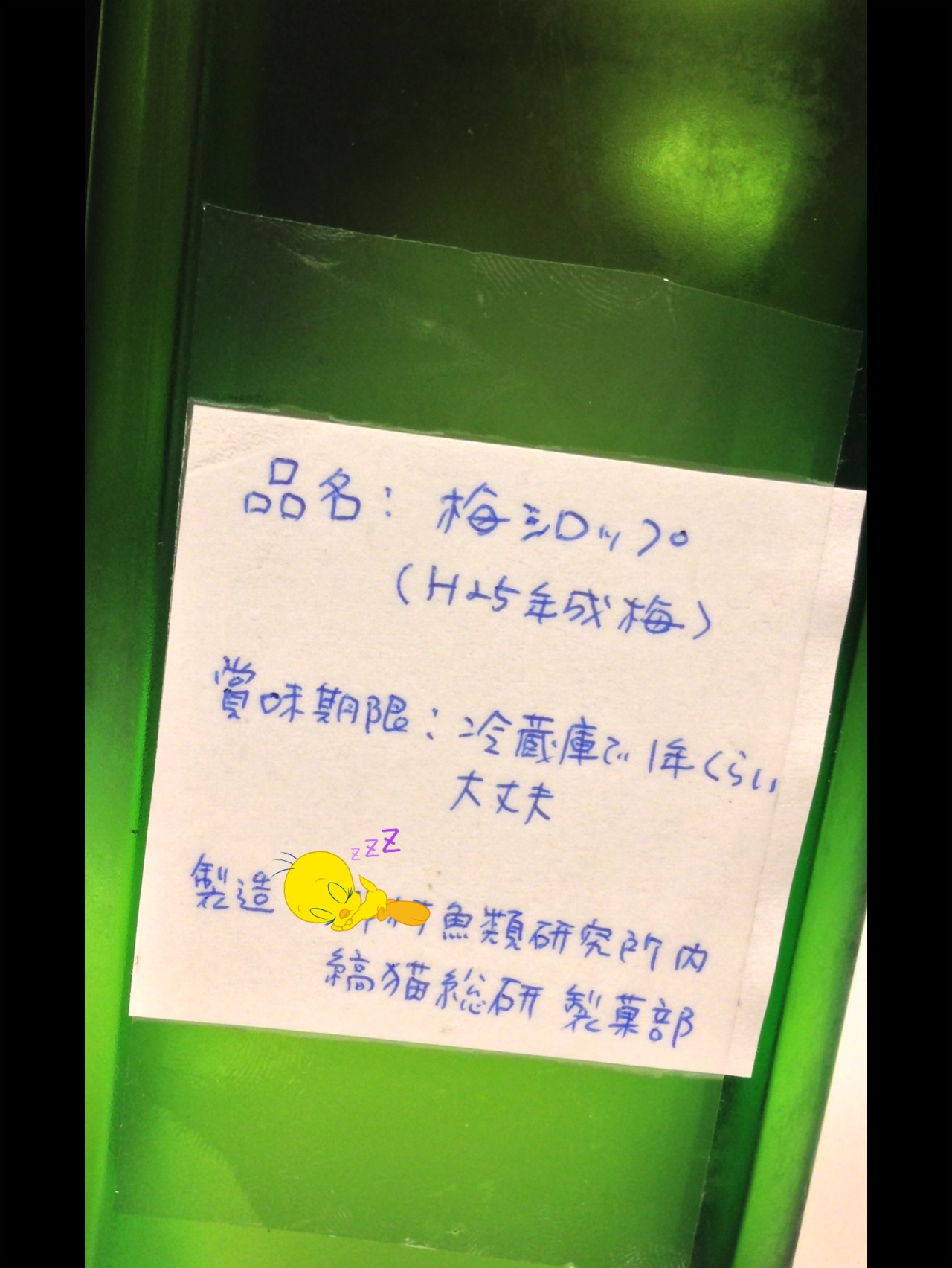 NMRさんからはシロップ。これは超絶可愛いてだちゃんイラストがラベルになっており、あまりの可愛さに来年のてだこ(^o^)亭年賀状に採用させていただく事になりました。だから、秘密ね(^o^)/裏のラベルをパシャ。