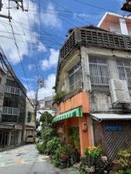 遠くに台風がいるから日陰は涼しい。オレンジの壁と同じ色のサンダンカ