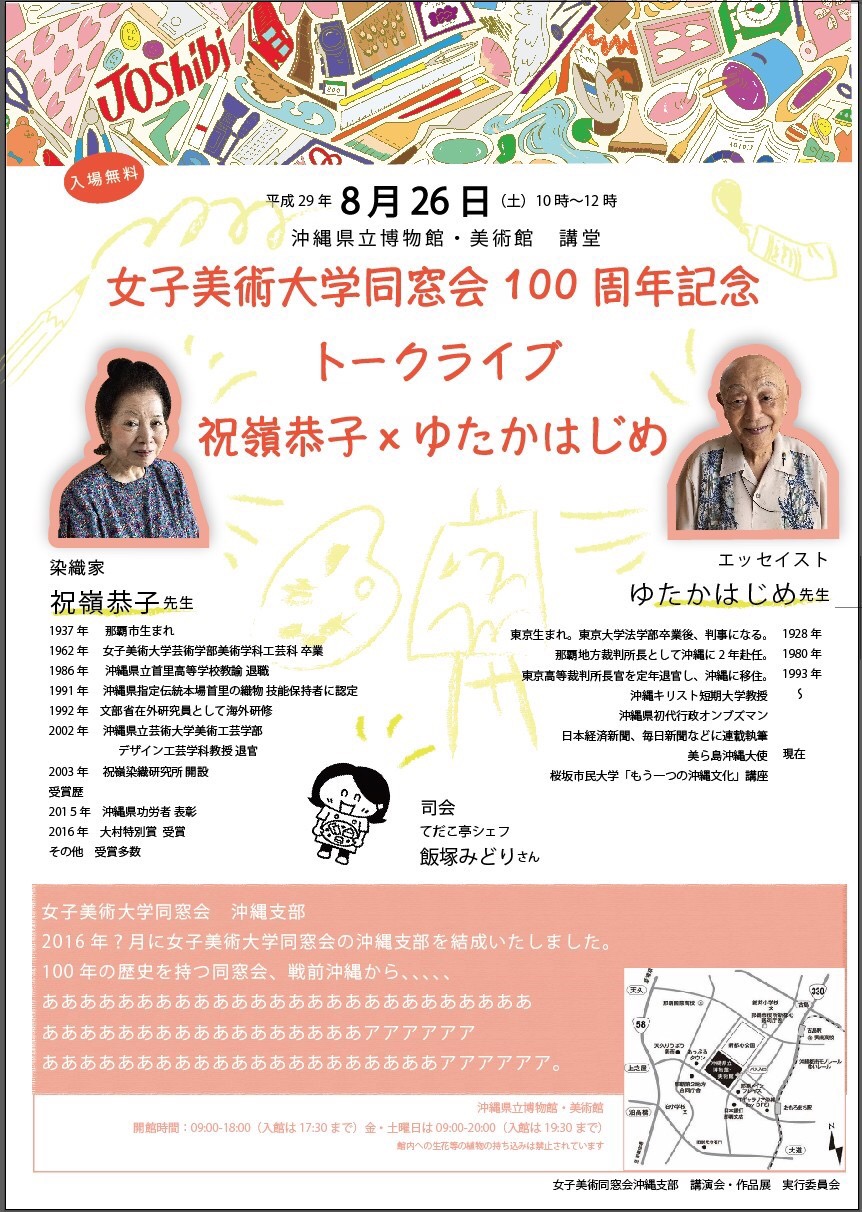 いよいよスタート 投稿日: 2017年8月21日 10:08 PM teda 女子美術大学同窓会沖縄支部作品展が明日8月22日から27日まで沖縄県立美術館ギャラリーにて開催致します。わたしは8月23日水曜日午後在廊、8月26日土曜日午前中トークライブの総合司会でお会いしましょう(^o^) 📂投稿グループ Pasha