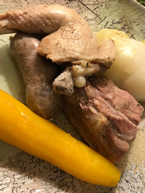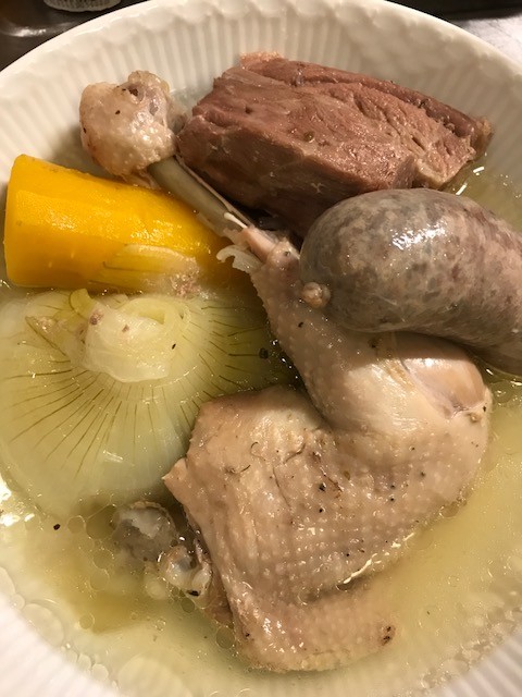 それは、今注目の❤福幸地鶏、そしてお馴染み❤の腸詰め(無添加てだこ(^o^)亭バージョン)、わたしの大好きな香りの良い糸満の豚肉を塊でドーン(≧∇≦)お野菜も、糸満の玉ねぎ、金美人参などおでんみたいにゴロゴロいれます。食べ方は、普通にポトフみたいに食べても、ボッリートミストみたいに、お皿に取り分けて、フォークとナイフで召し上がっても!←意外とオススメ。(スープはスープで別のカップなどについで、別々にたべます)地鶏、豚肉、ソーセージ、ともう肉食なあなたは絶対幸せになるはず。(わたしなりますw)分量は、一人だと、かなりお腹いっぱい、か、食べ切れないかな?くらい…二人だとサラダなどご用意したらちょうど良いくらいの感じです。これにてだこ(^o^)亭国産小麦フォカッチャをつけます。(今回はデザート用お菓子は別になります)お肉は骨つきや塊ですが、柔らかく煮てありますからたべやすいです(^。^)。